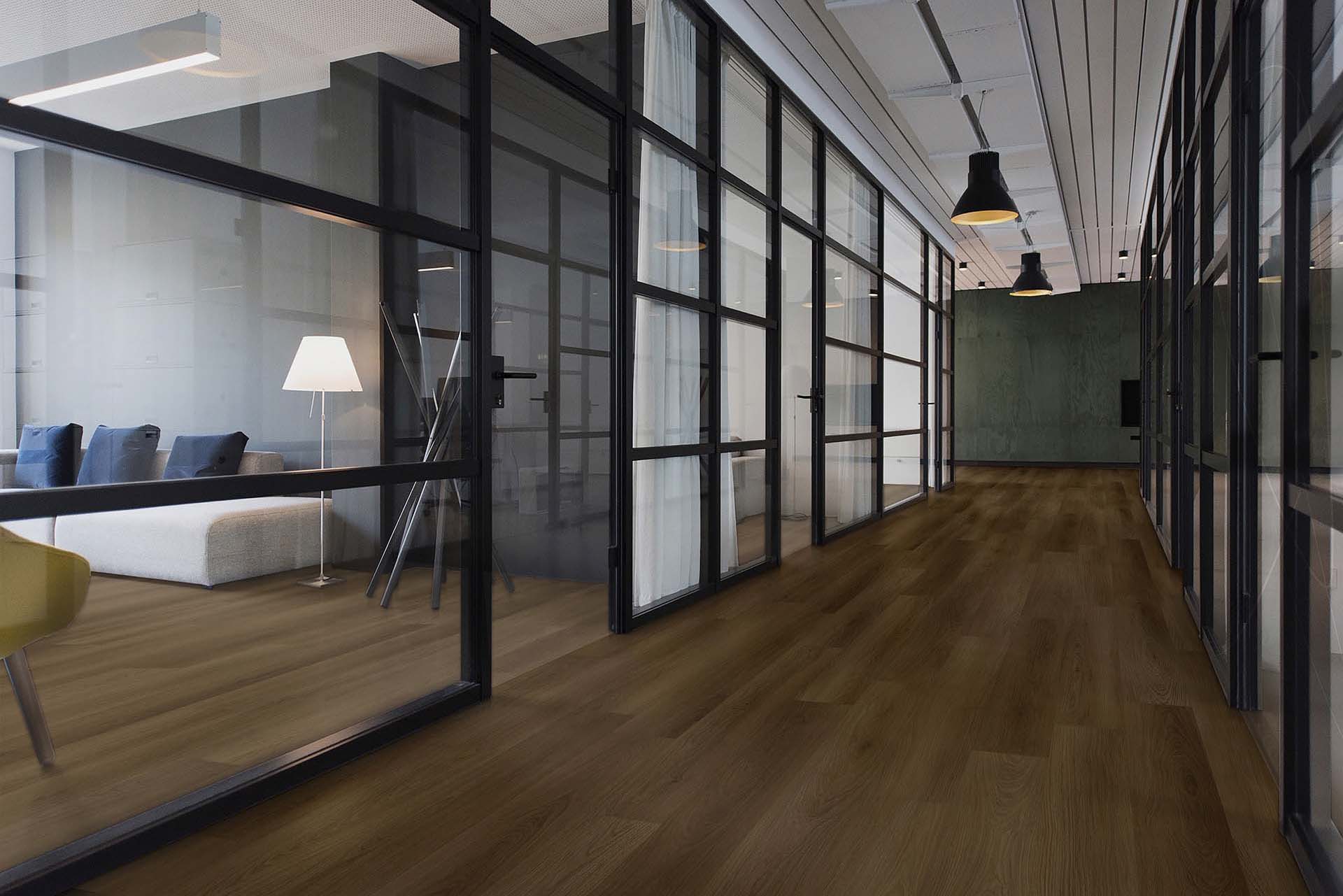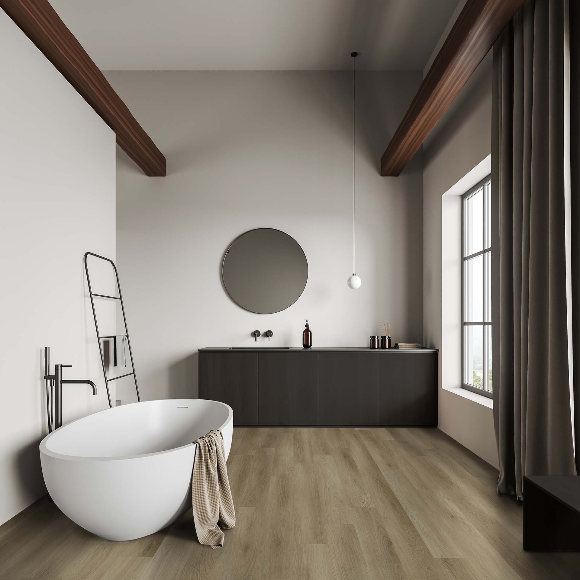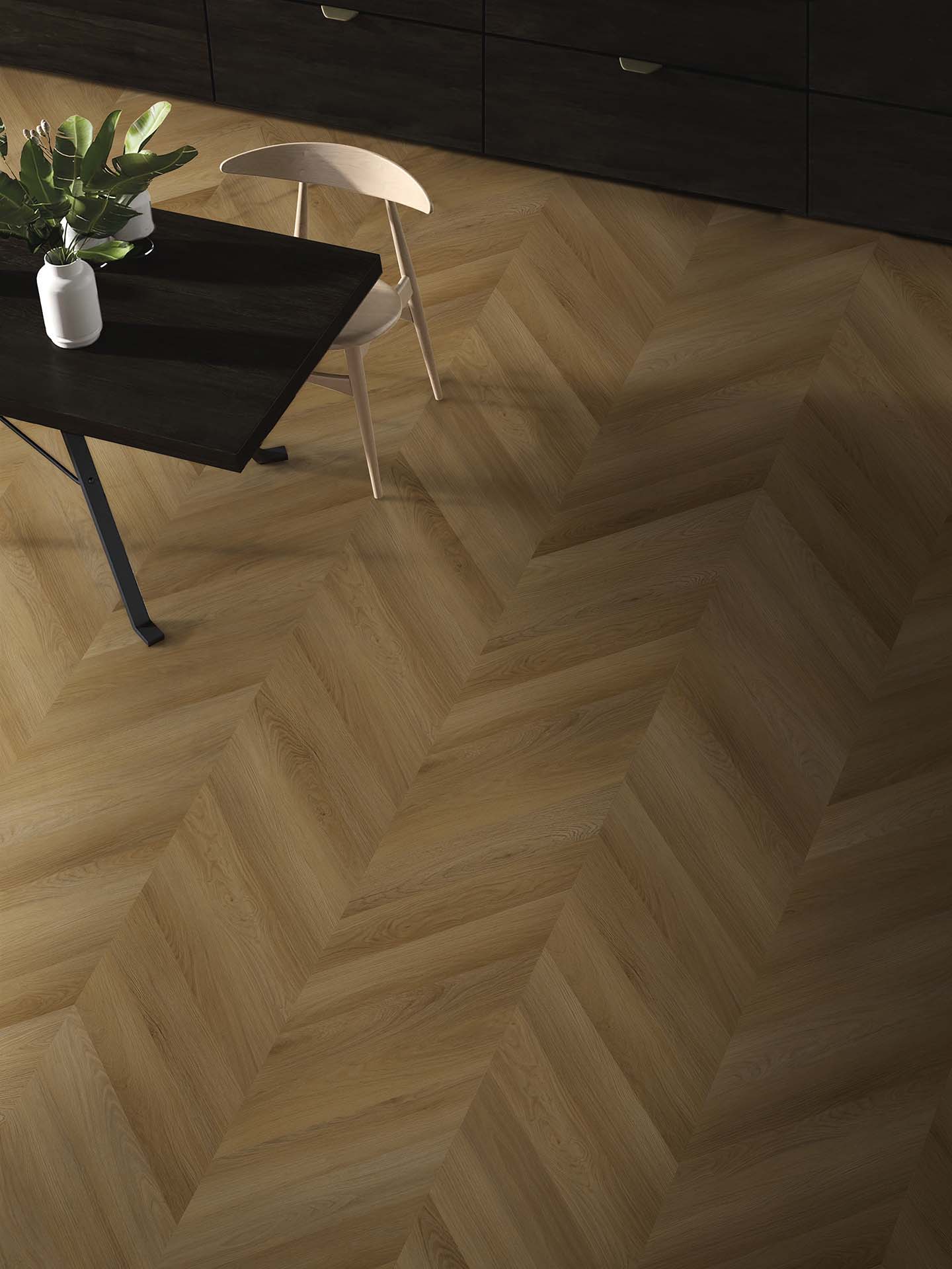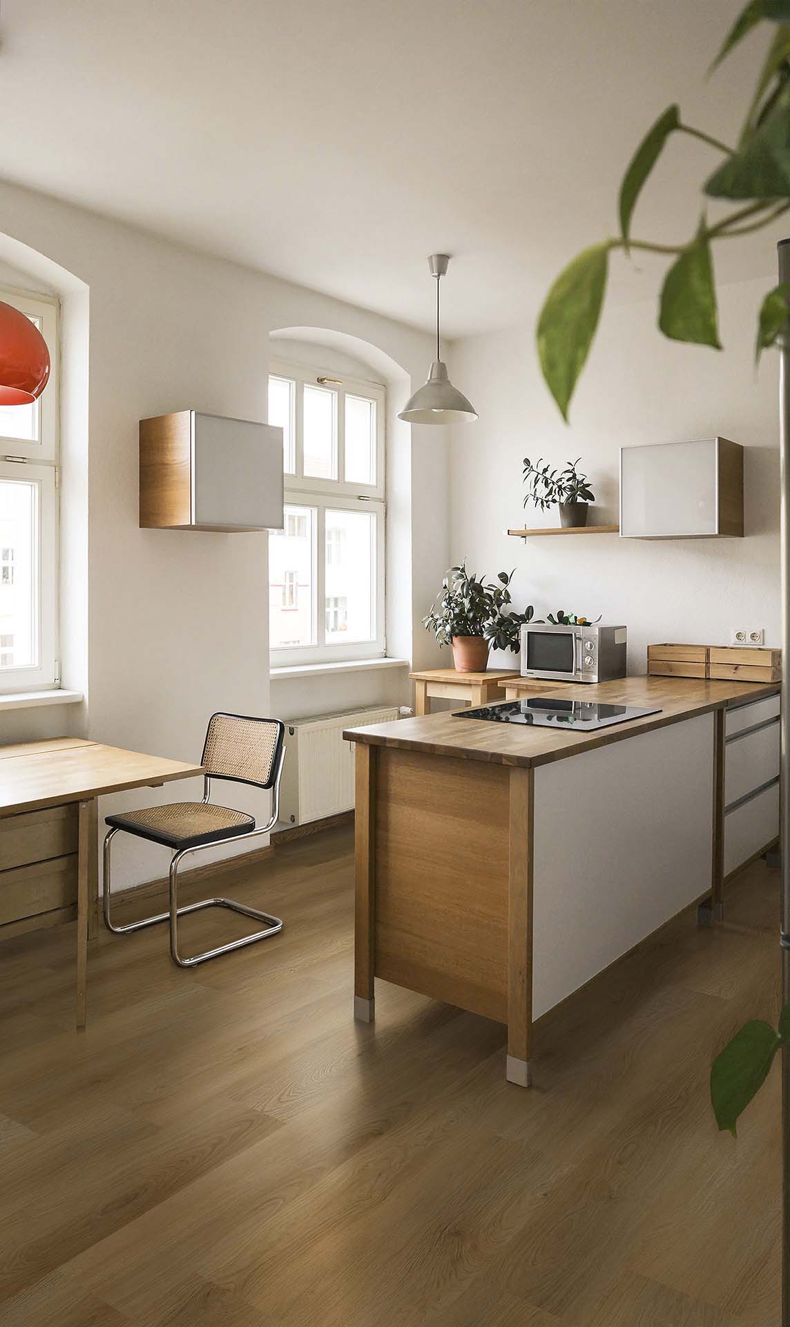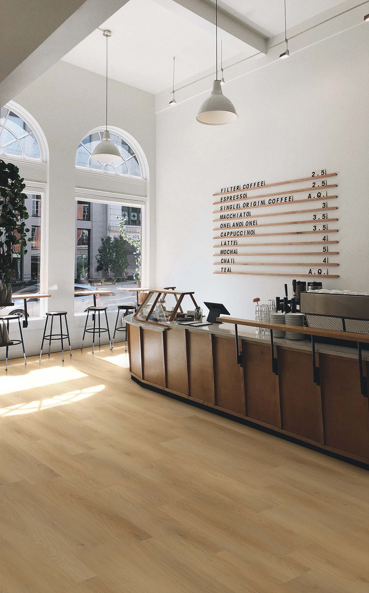 Rivestimento in SPC con colori caldi, un effetto naturale e pochi nodi per un ambiente che diventa moderno ma allo stesso tempo capace di adattarsi a ogni contesto grazie al suo essere minimal e autentico.